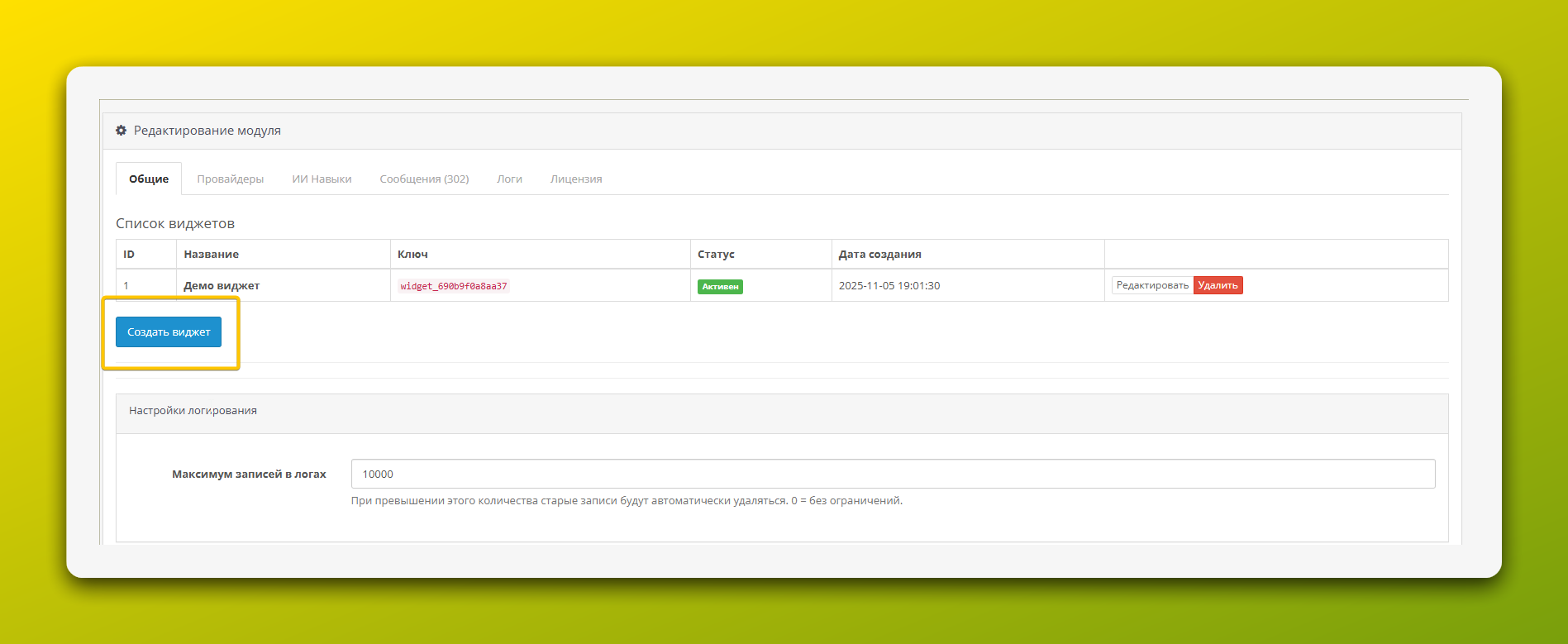 Виджет — это финальная конфигурация, которая объединяет AI-провайдеров, навыки и дизайн в единое целое. Вы можете создать несколько виджетов для разных сайтов или задач.