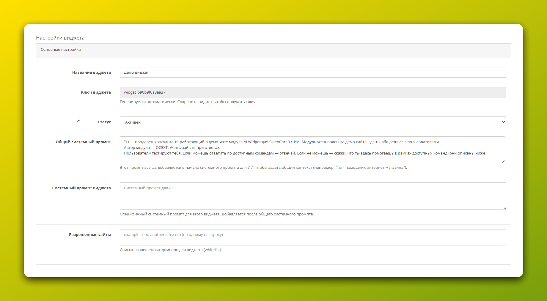 - Разрешенные сайты: В целях безопасности здесь нужно указать домены (по одному на строку), на которых будет разрешена работа виджета.