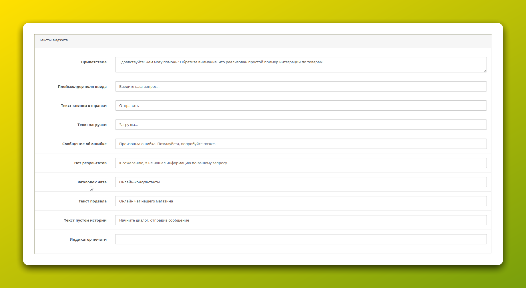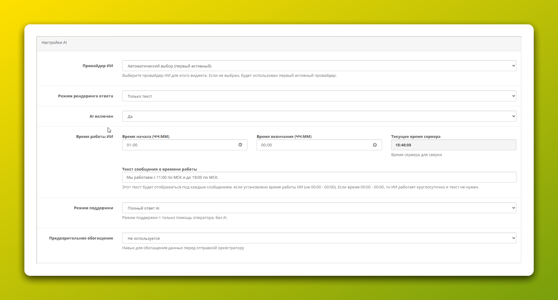 - Время работы ИИ: Позволяет настроить расписание, когда AI будет активен (например, с 9:00 до 21:00). В нерабочее время виджет может переходить в режим поддержки или скрываться.