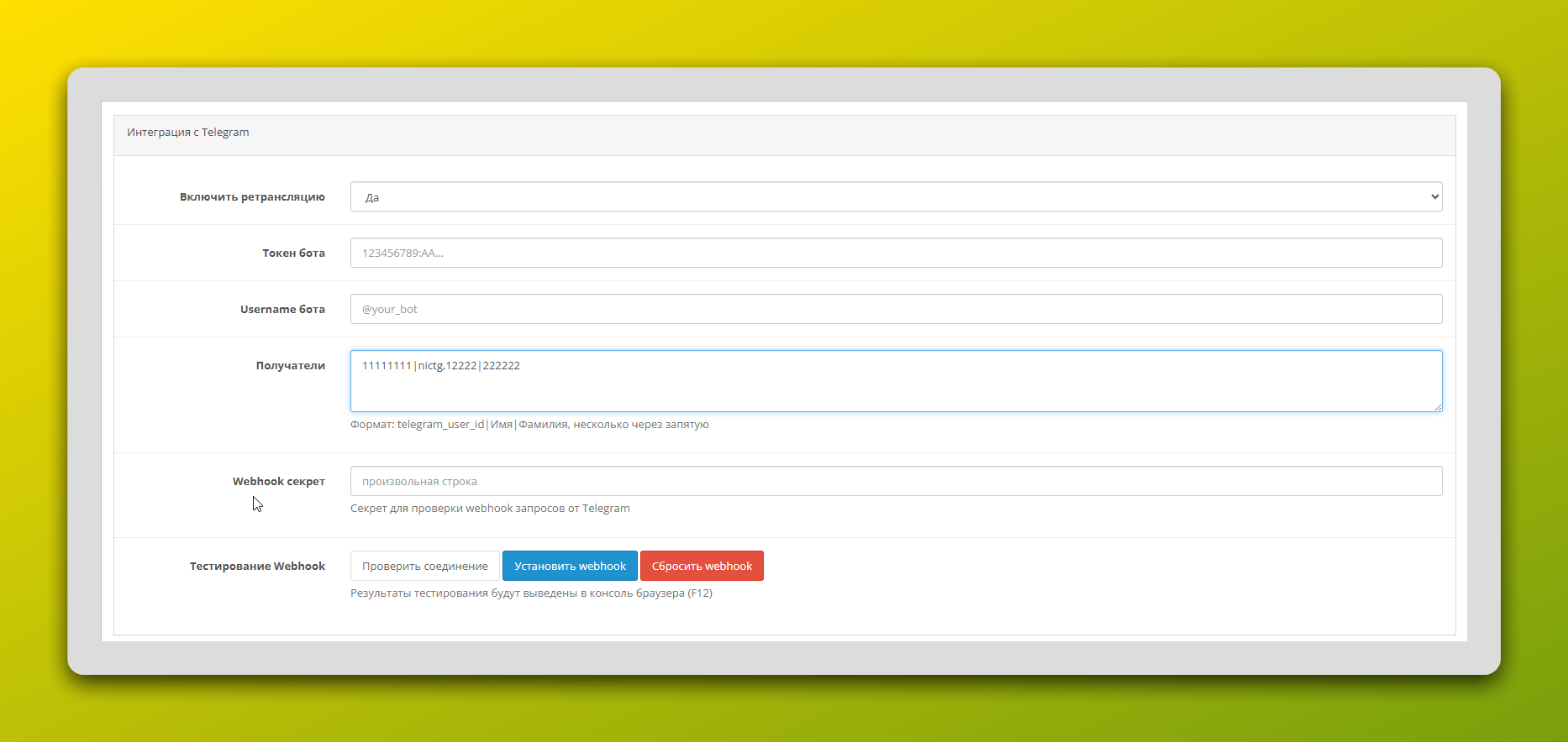 - Получатели: Список ID менеджеров, которые будут получать уведомления. Формат важен: