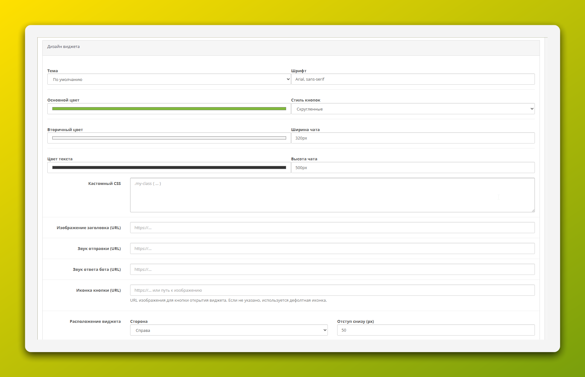 На соответствующих вкладках вы можете полностью настроить внешний вид виджета: цвета, шрифты, положение на экране, иконки, звуки, а также все текстовые надписи — от приветствия до текста на кнопках.
