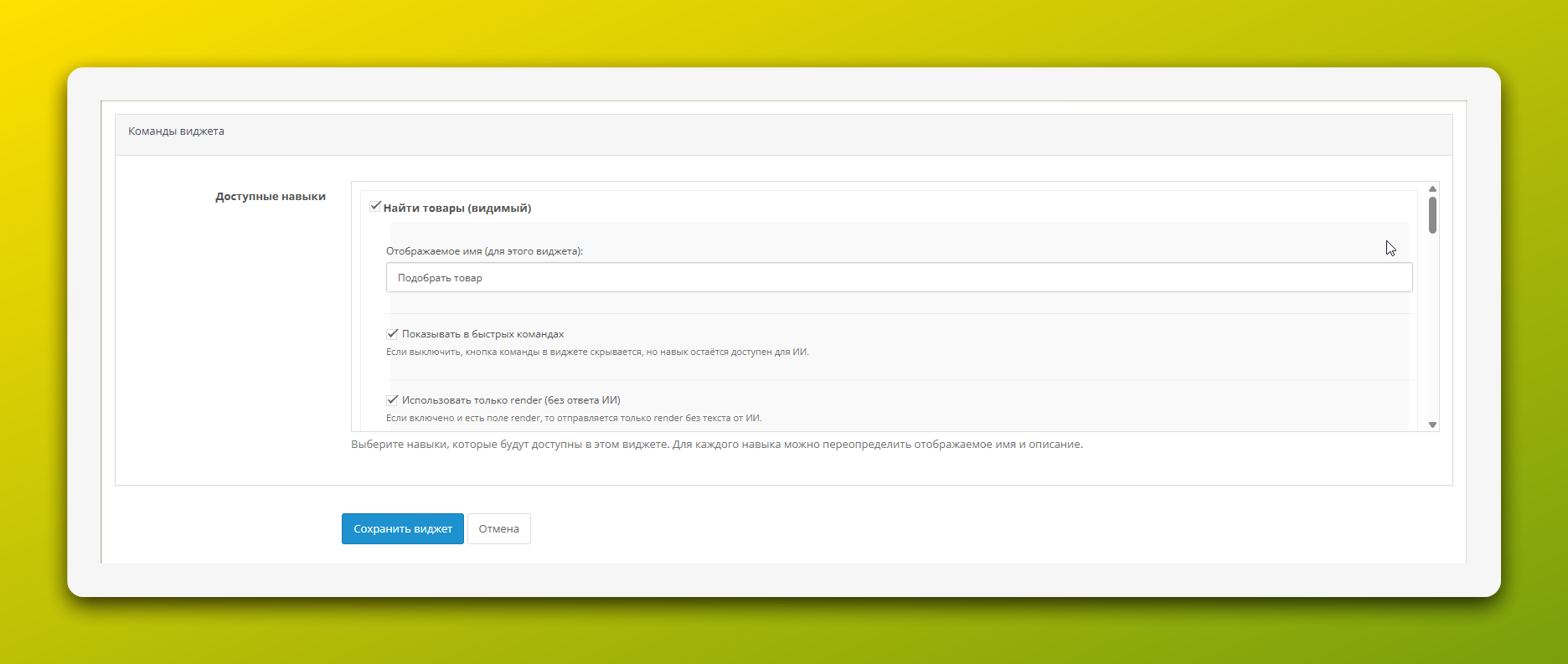 После того как вы настроили все параметры, нажмите «Сохранить навык». Теперь ваш AI-ассистент умеет искать товары, если его добить в соответствующий виджет.