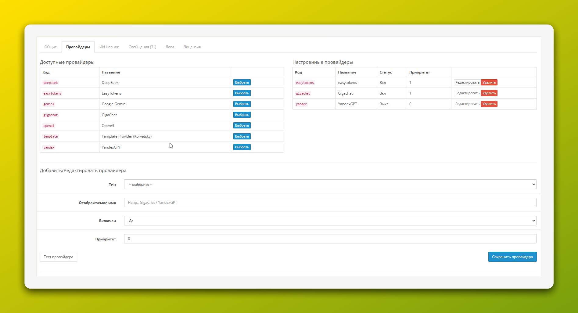 AI-провайдер — это нейросеть, которая будет генерировать ответы. Первым делом нужно подключить хотя бы одного провайдера.