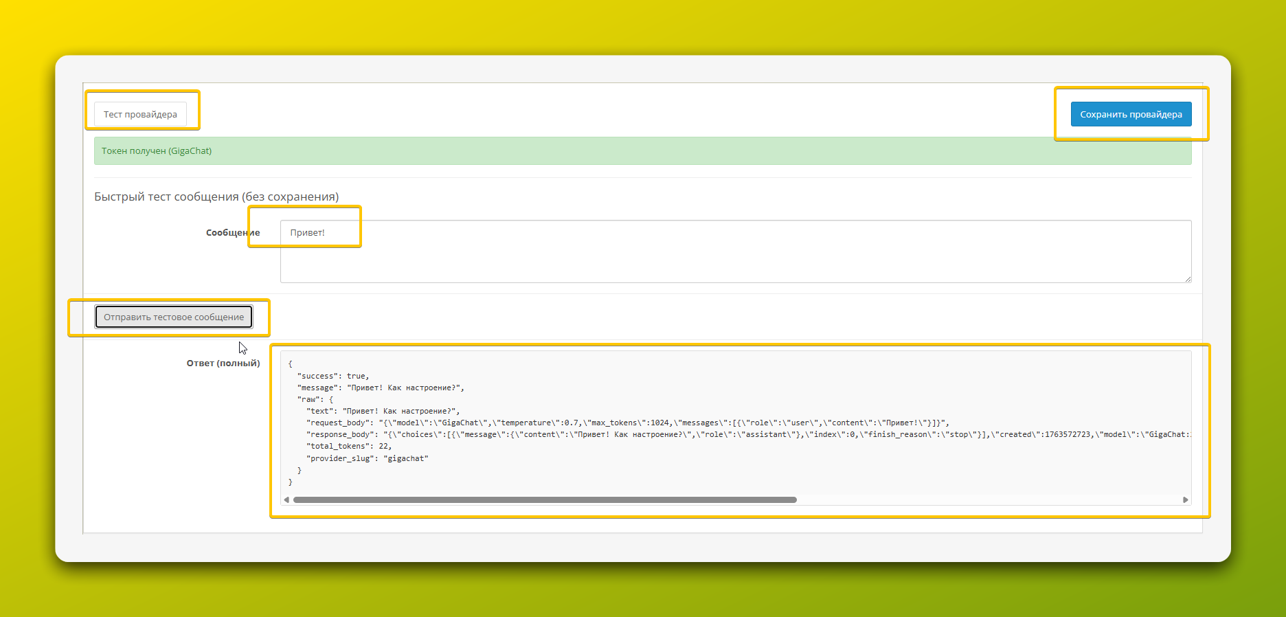 - Нажмите кнопку «Тест провайдера». Отправьте тестовый запрос, чтобы убедиться, что настройки верны.