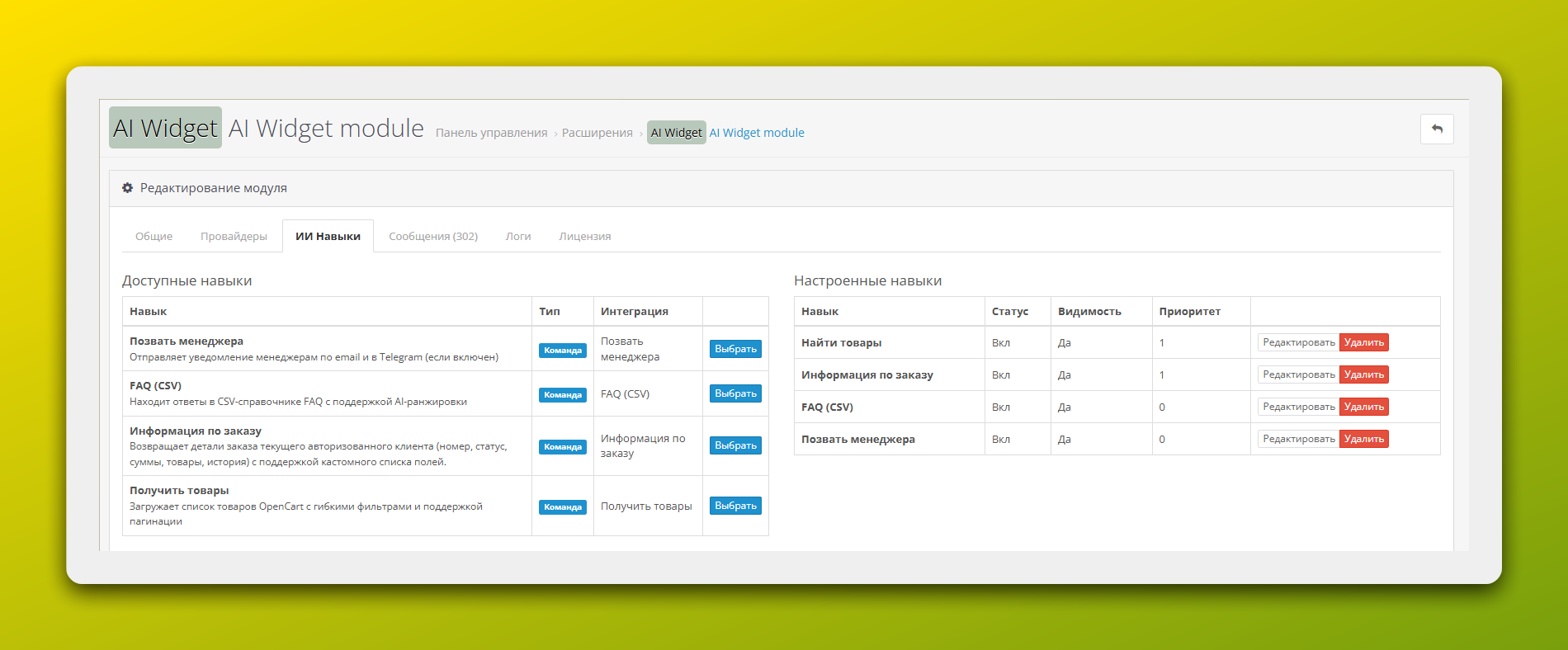 Навыки — это инструменты, которые AI использует для доступа к информации вашего магазина. Чтобы ассистент мог отвечать на вопросы о товарах, ему нужно дать соответствующий навык.
