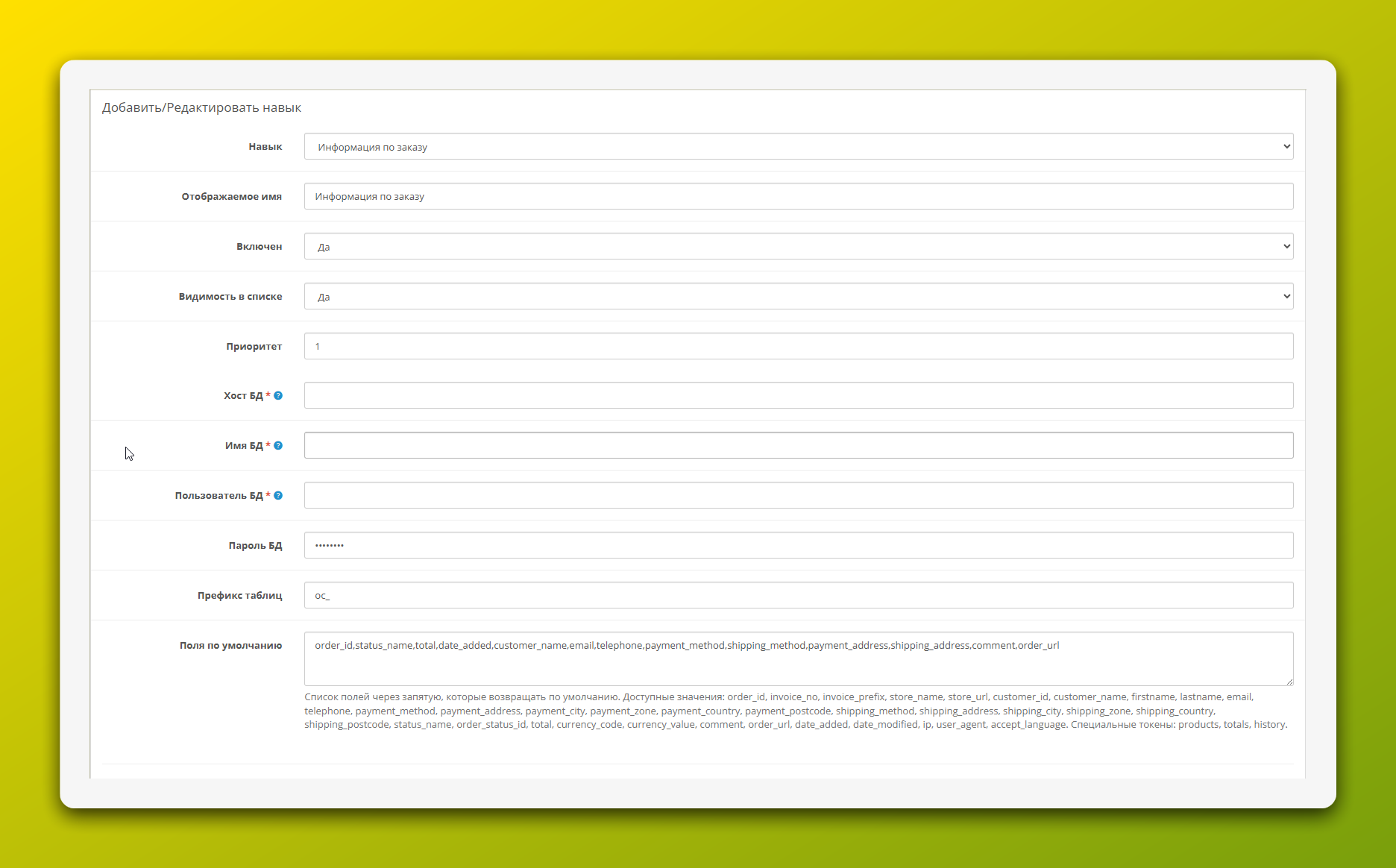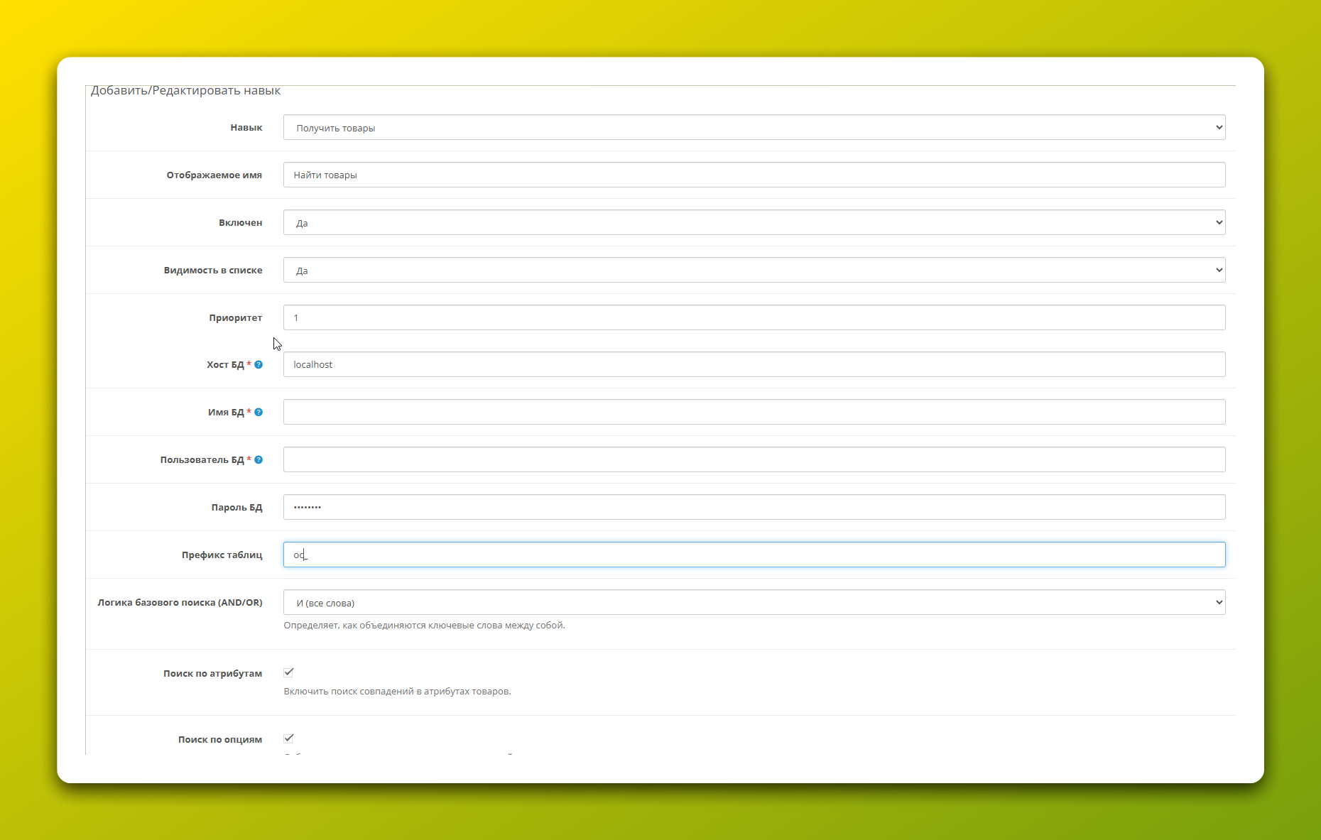 Навык запрашивает прямые реквизиты для подключения к базе данных OpenCart. Это сделано для максимальной производительности: поиск выполняется быстрыми SQL-запросами, не загружая весь фреймворк магазина.
