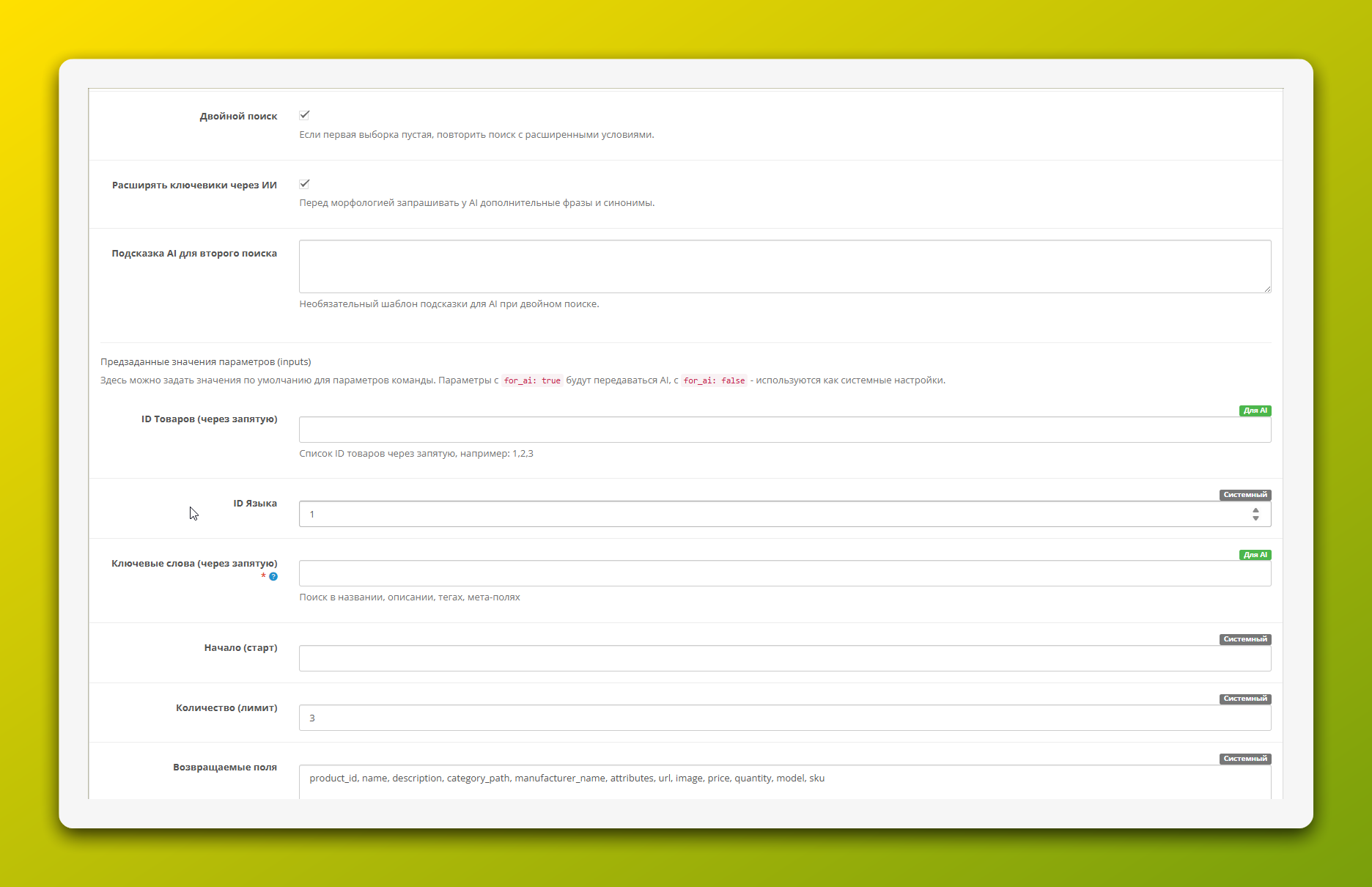 Поля по умолчанию: Ключевая настройка. Это список полей, которые будут возвращены по умолчанию. Чем точнее вы укажете список, тем меньше лишних данных будет передано в нейросеть, что экономит токены и повышает точность ответа. Пример:
