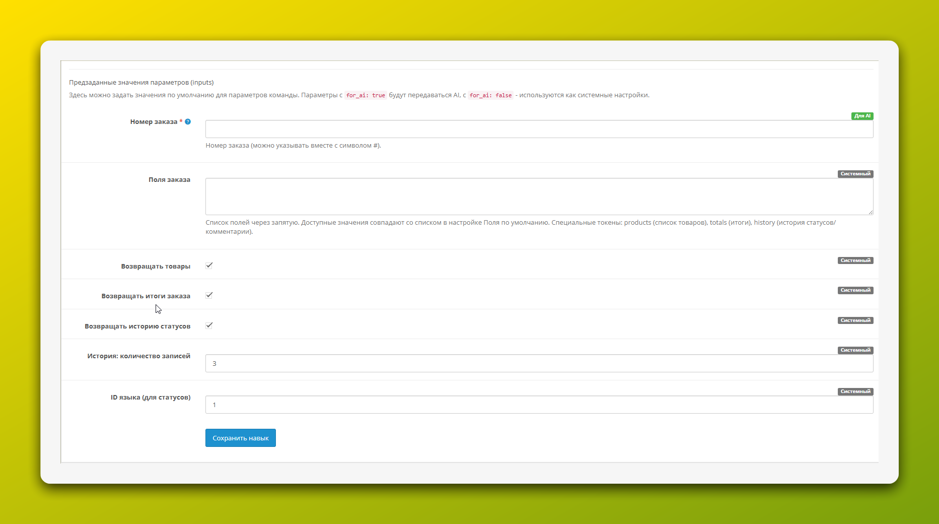Чтобы AI-ассистент мог помогать клиентам с их заказами, ему необходим соответствующий навык. Он позволяет получать статус, состав и историю заказа.