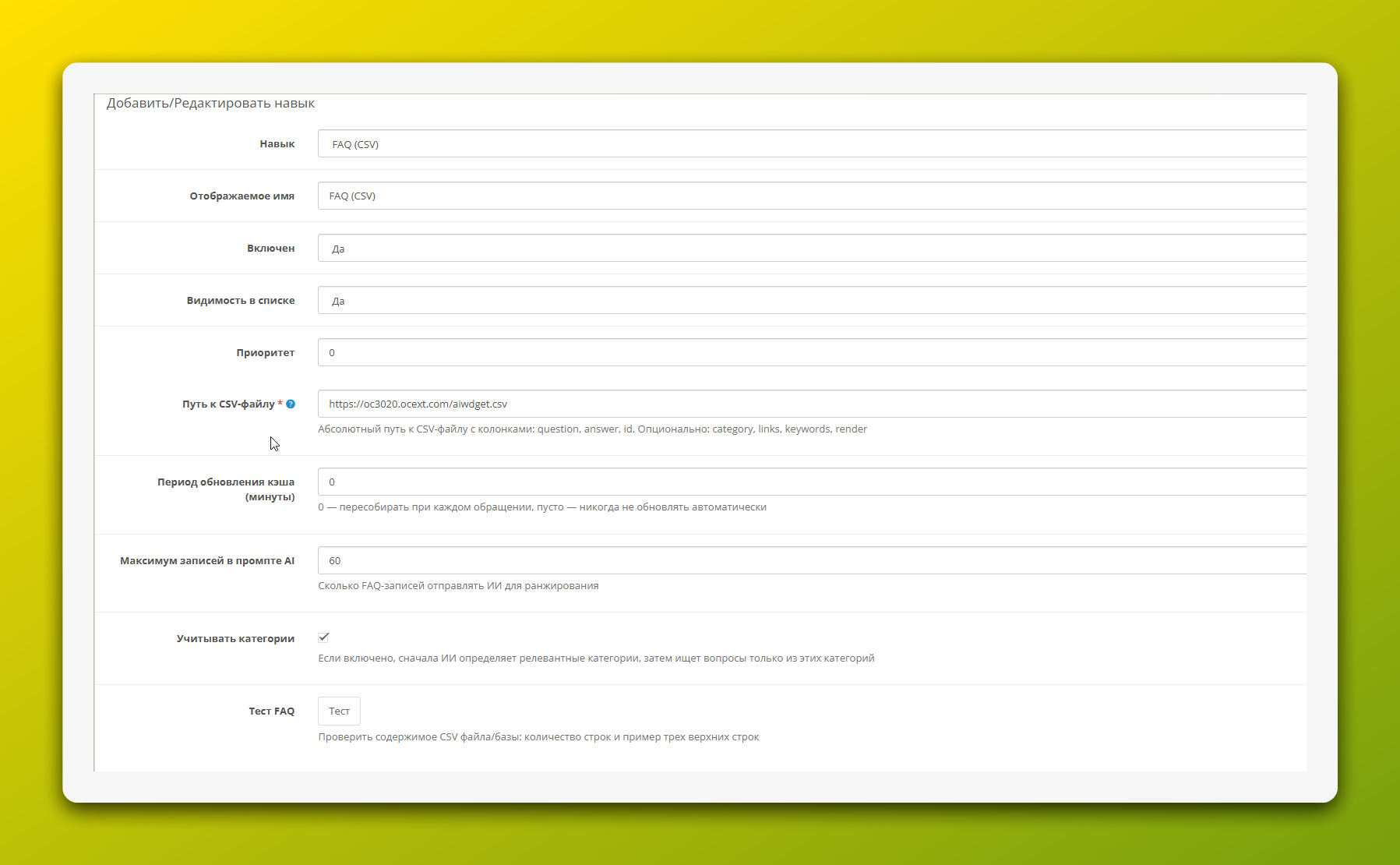 - Тест FAQ: Обязательно используйте эту кнопку. Она проверит доступность вашего CSV-файла, правильность его структуры и покажет первые несколько записей для контроля.