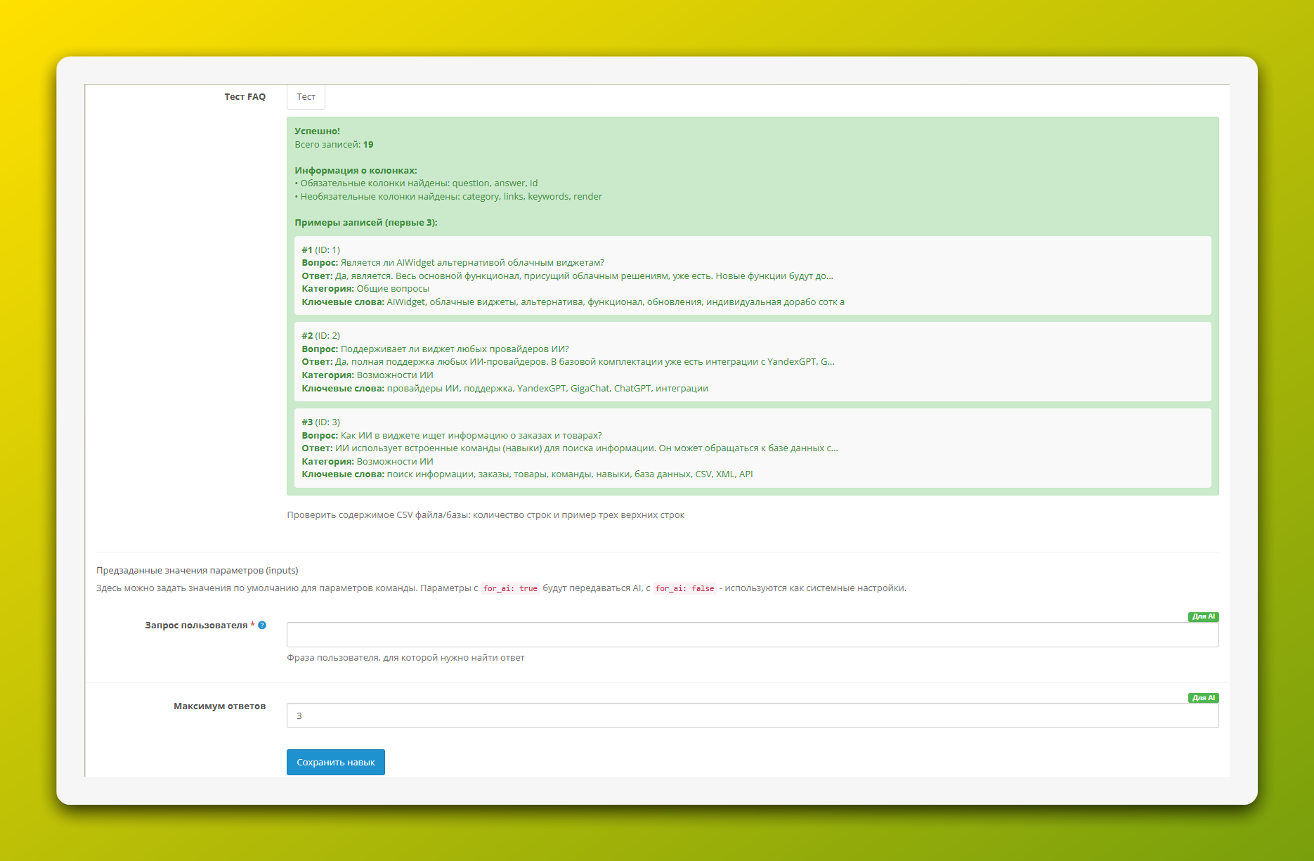 После подготовки файла перейдите на вкладку «ИИ Навыки», выберите «FAQ (CSV)» и заполните поля: