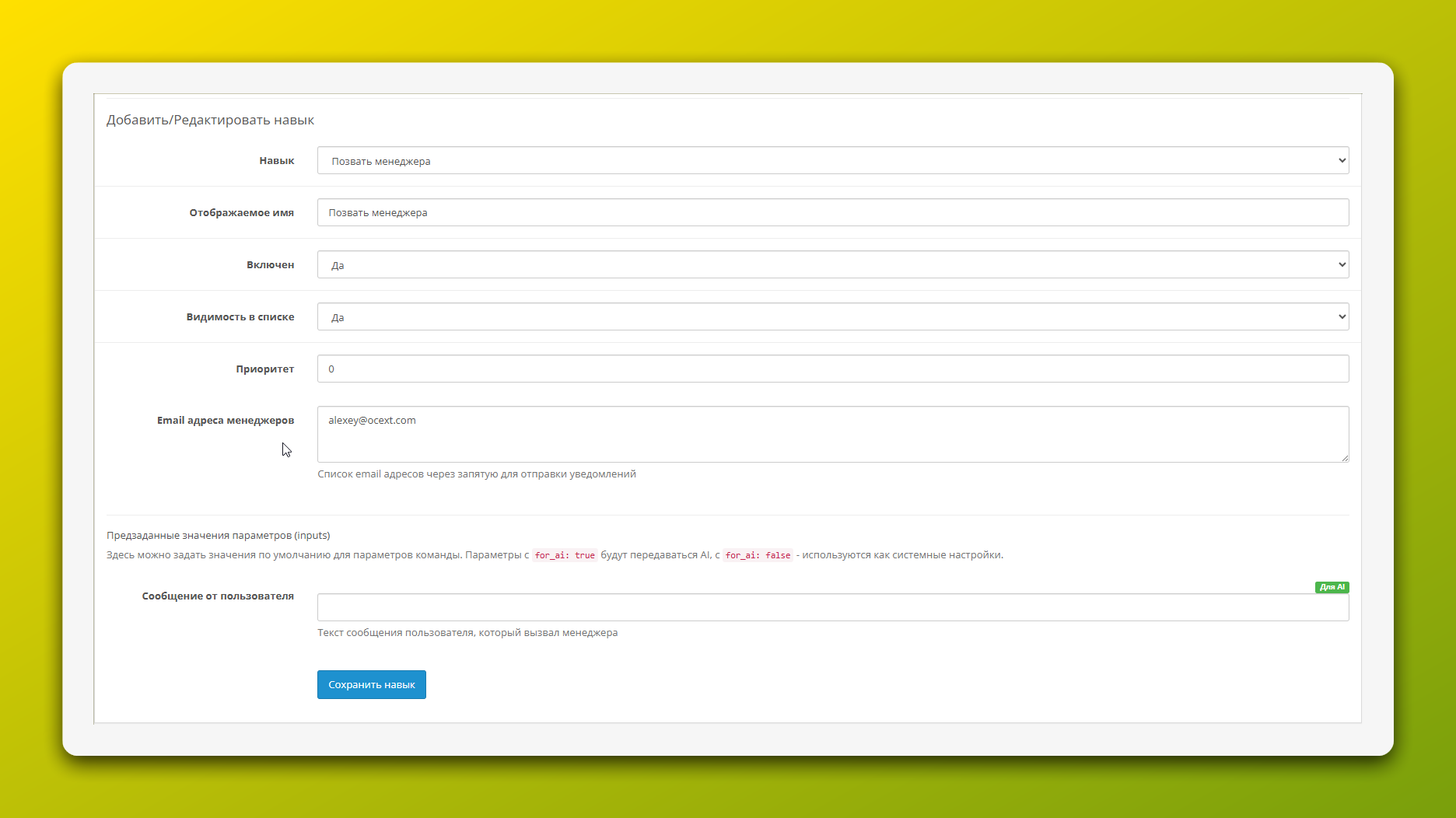 Этот навык — прямой канал связи с вашей командой. Когда AI не может помочь или клиент явно просит позвать человека, активируется именно эта функция для эскалации диалога.